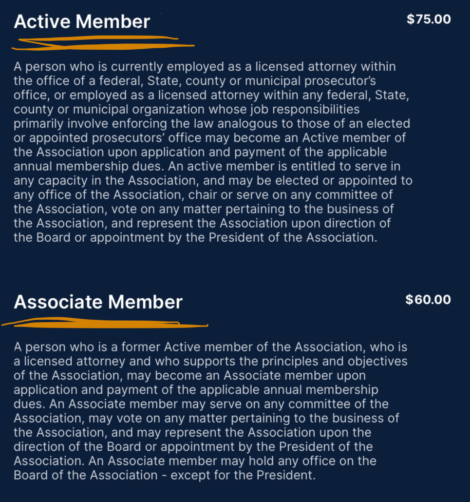 A person who is currently employed as a licensed attorney within the office of a federal, State, county or municipal prosecutor’s office, or employed as a licensed attorney within any federal, State, county or municipal organization whose job responsibilities primarily involve enforcing the law analogous to those of an elected or appointed prosecutors’ office may become an Active member of the Association upon application and payment of the applicable annual membership dues. An active member is entitled to serve in any capacity in the Association, and may be elected or appointed to any office of the Association, chair or serve on any committee of the Association, vote on any matter pertaining to the business of the Association, and represent the Association upon direction of the Board or appointment by the President of the Association.