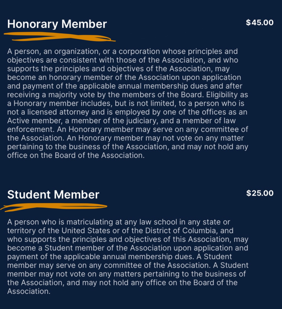 A person, an organization, or a corporation whose principles and objectives are consistent with those of the Association, and who supports the principles and objectives of the Association, may become an honorary member of the Association upon application and payment of the applicable annual membership dues and after receiving a majority vote by the members of the Board. Eligibility as a Honorary member includes, but is not limited, to a person who is not a licensed attorney and is employed by one of the offices as an Active member, a member of the judiciary, and a member of law enforcement. An Honorary member may serve on any committee of the Association. An Honorary member may not vote on any matter pertaining to the business of the Association, and may not hold any office on the Board of the Association.
